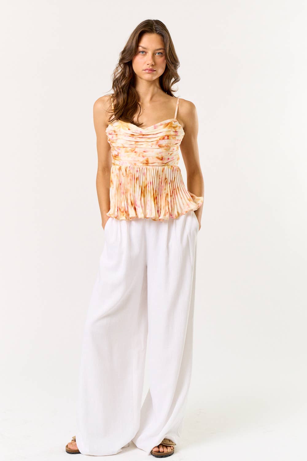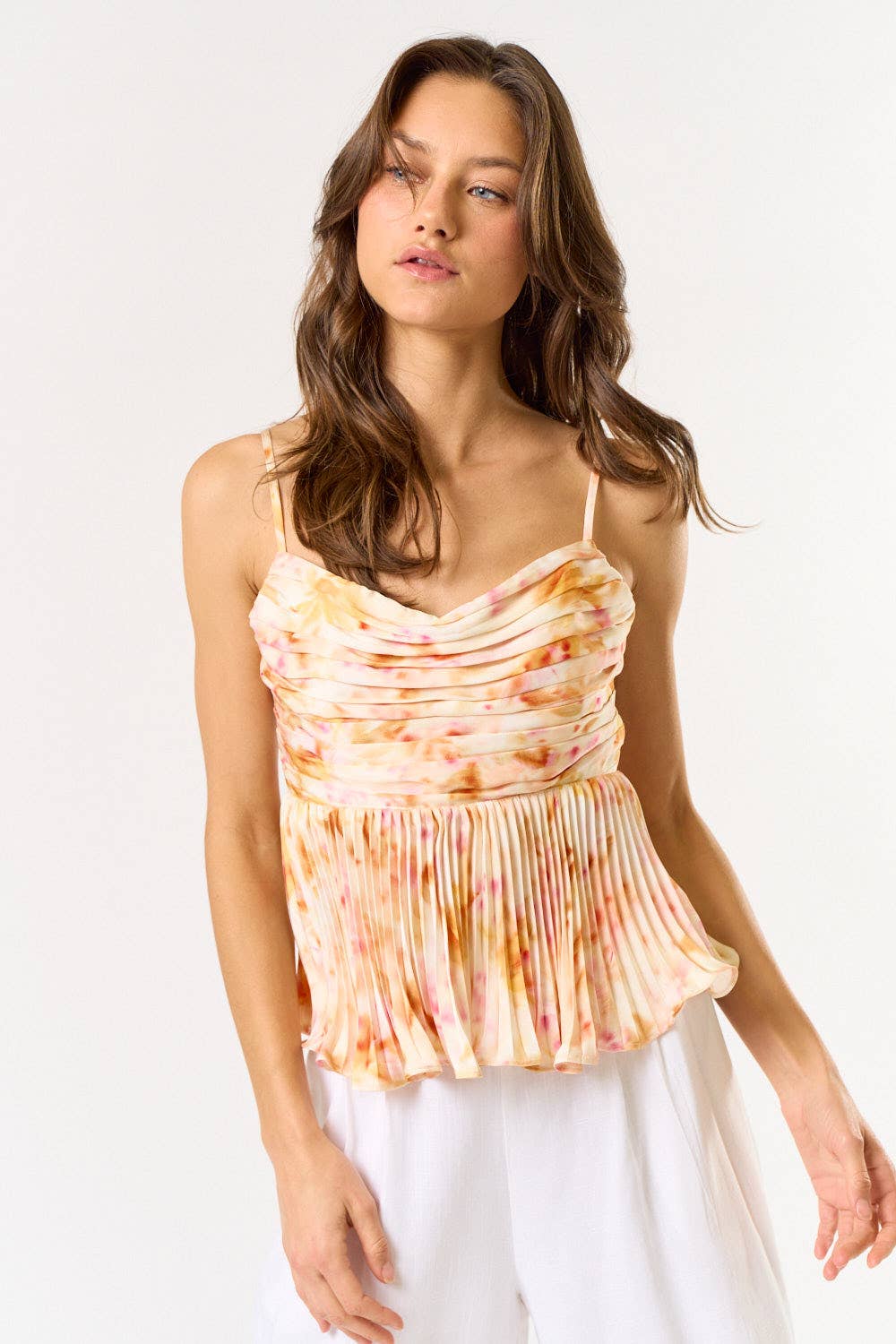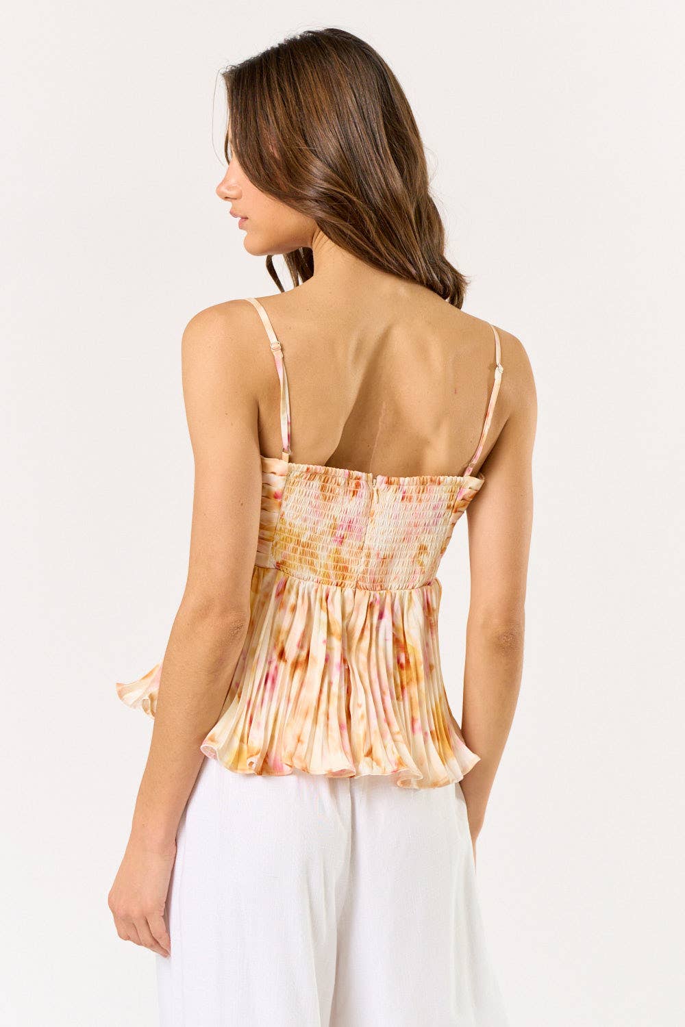 Satin tie-dye pleated babydoll top is a stylish and breezy piece, perfect for summer. The satin fabric gives it a soft, luxurious feel, while the tie-dye pattern adds a playful, vibrant touch. The pleated design creates movement and texture, and the smocked back ensures a comfortable, flattering fit. - Pleated design - Square neckline - Adjustable spaghetti straps - Lettuce trim