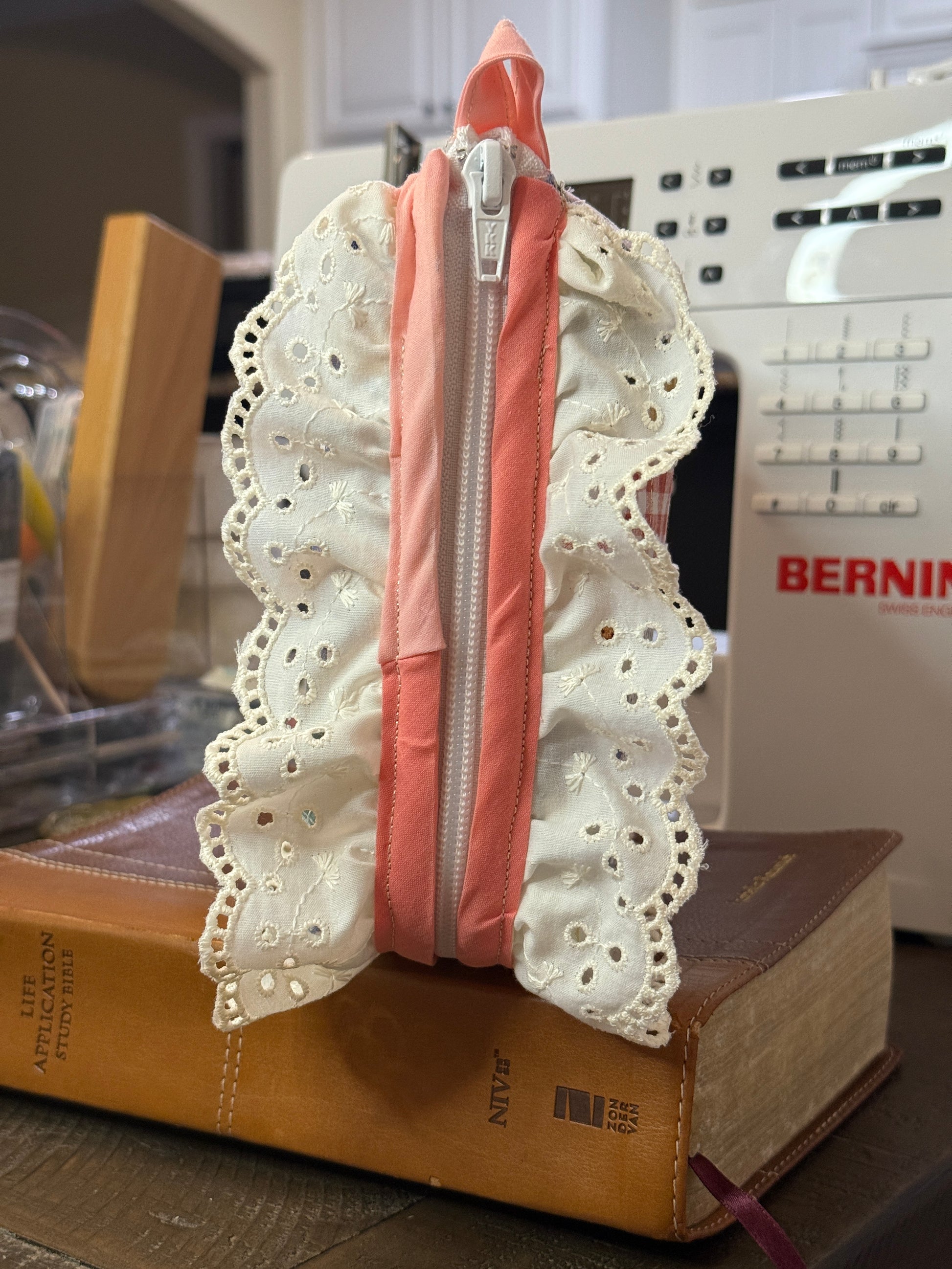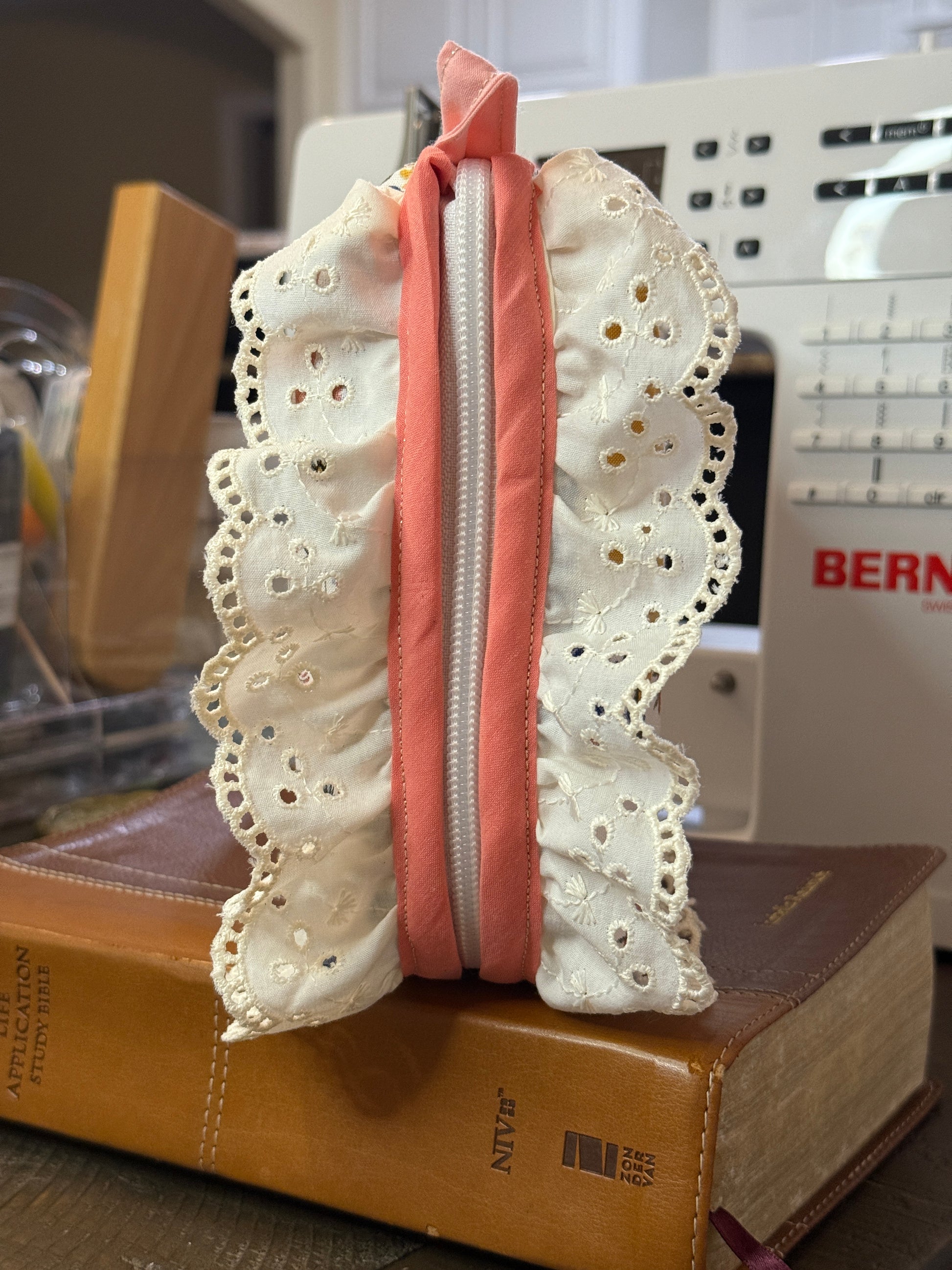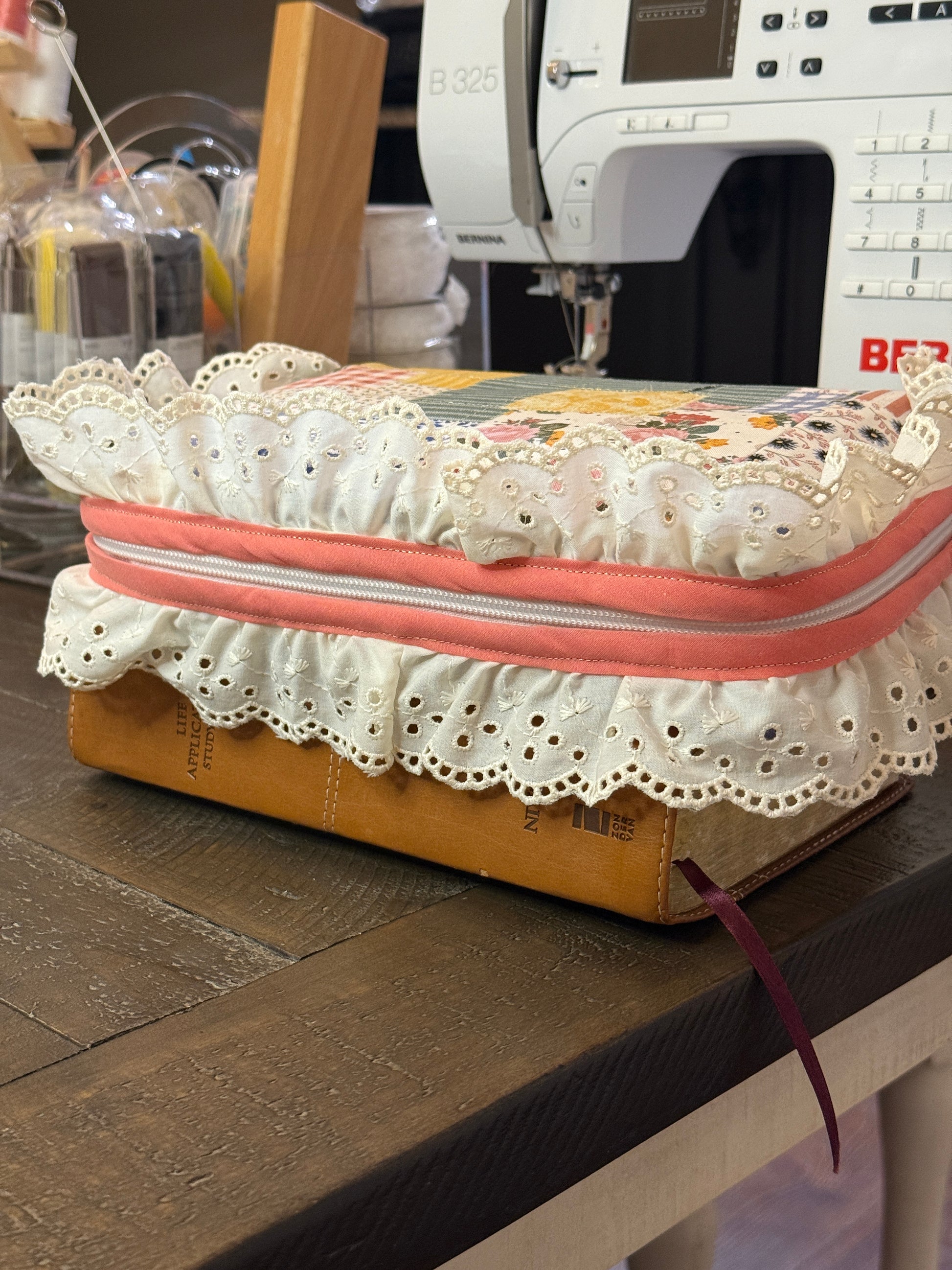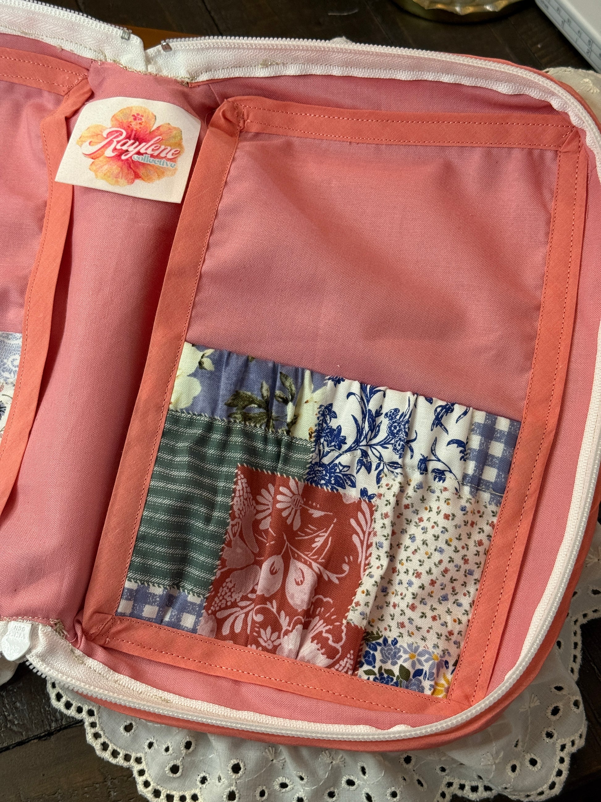 Handmade by Izabella Raylene. This Quilted Bible Bag is the perfect fit for a 2-3 inch thick Bible. It has cover sleeves, pencil pockets, and a stretch pocket in the back. A comfortable handle and sleek zipper with pull tabs that also double as a hook tab for an attachable cross-body strap (strap not included).